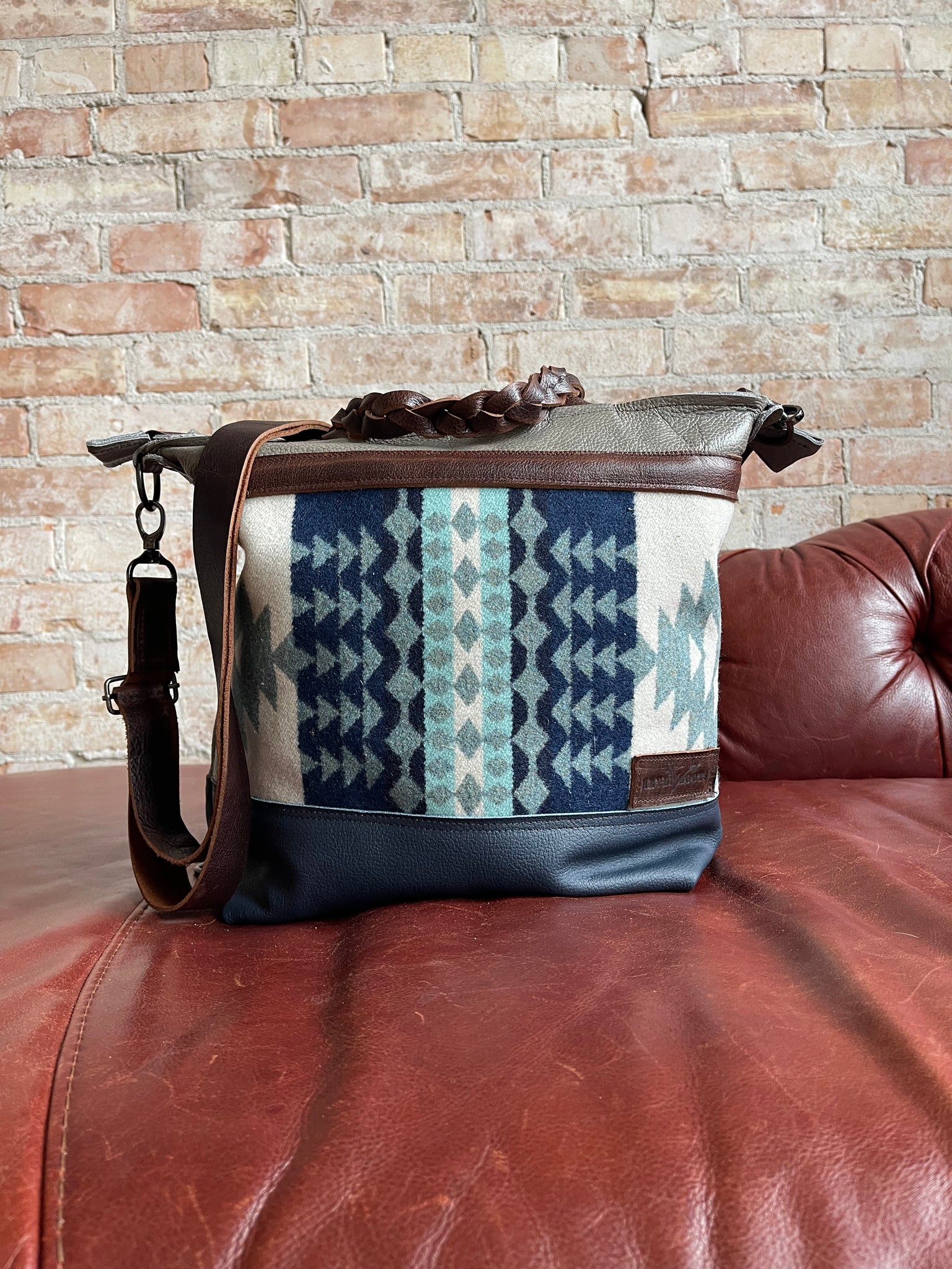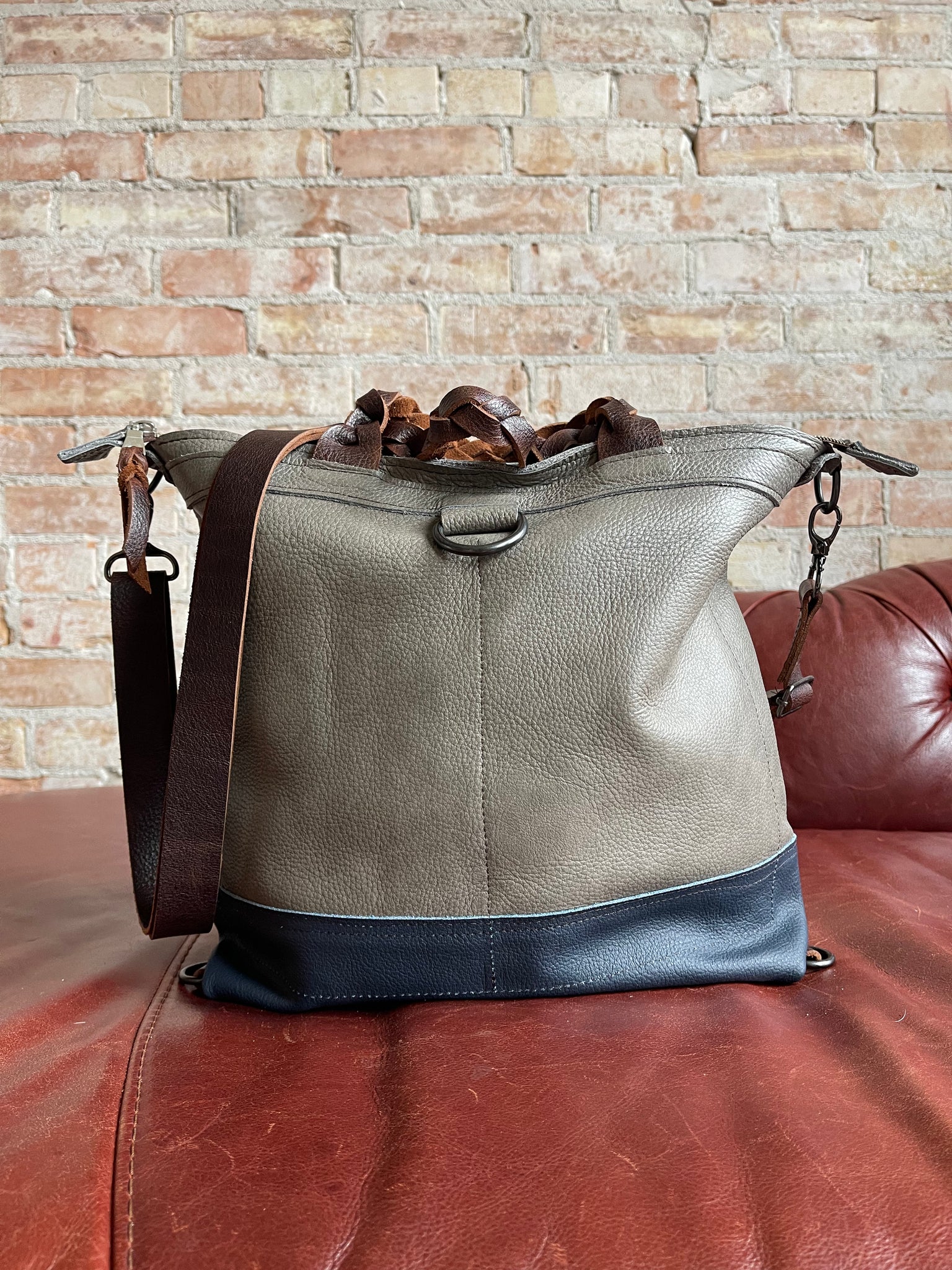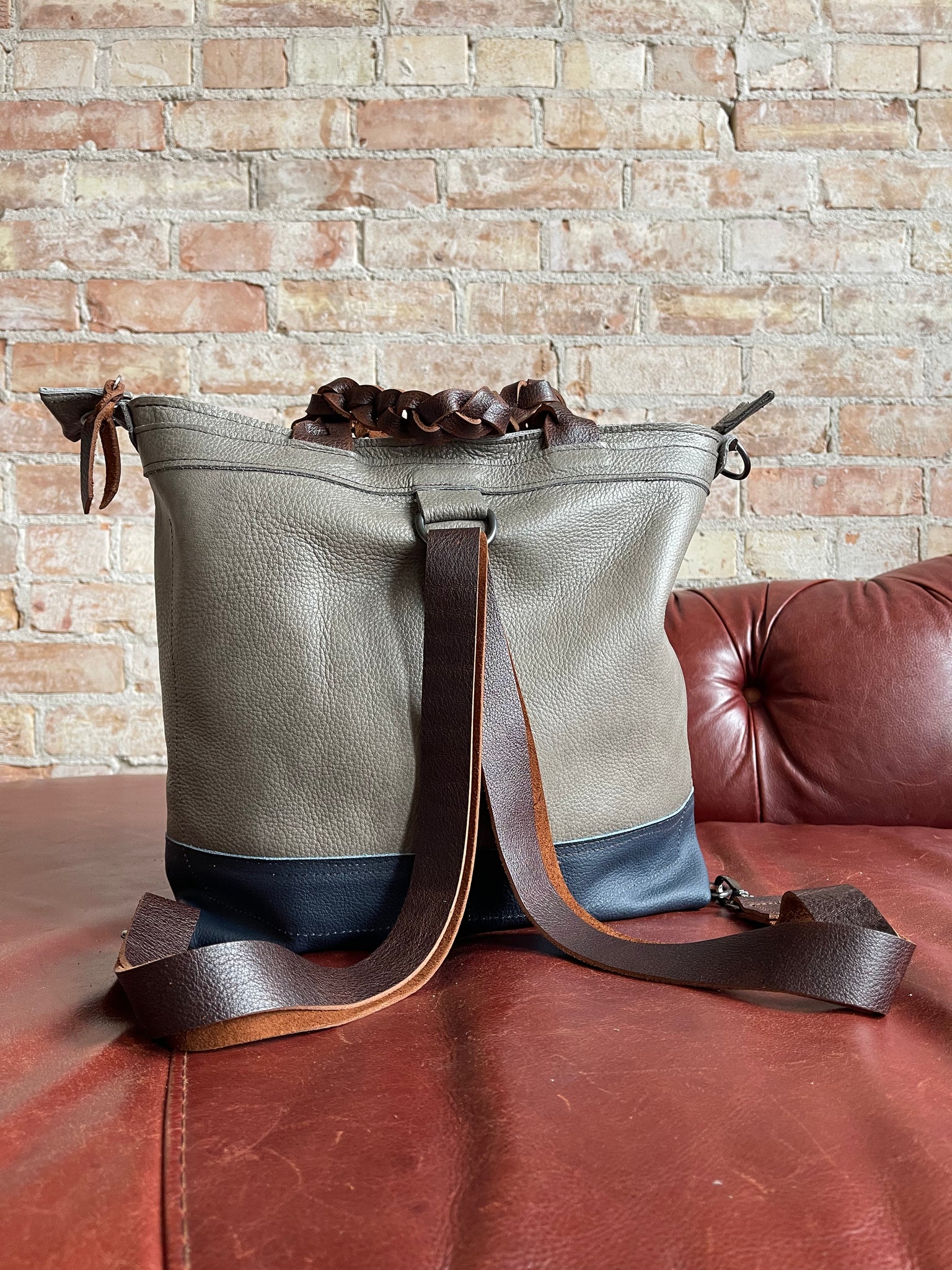 • Grey + Blue cowhide on the main body, Brown cowhide used for the braided handles and strap